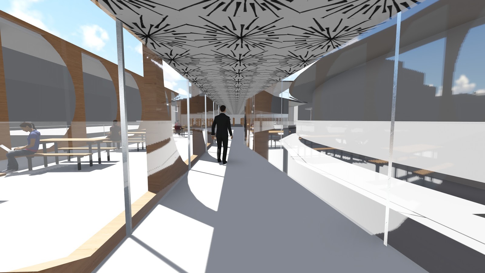 Moving element 1 - the first moving element is located along the passage connecting the two modules of the staff area. It consists of two sliding panels which can slide across (as shown in the video below) to both obscure staff areas for more privacy and to create an open air walkway. This alludes to the theory as it allows occupants to adjust and redefine space for themselves.